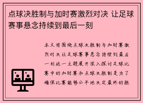 在足球比赛中,点球大战和加时赛常常是决定比赛胜负的关键时刻。点球大战,作为一种决胜的法宝,在过去的比...