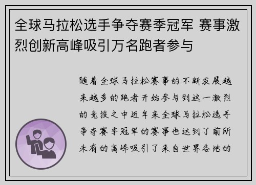 随着全球马拉松赛事的不断发展,越来越多的跑者开始参与到这一激烈的竞技之中。近年来,全球马拉松选手争夺赛季冠军的赛事也达到了前所未有的高峰,吸引了来自世界各地的万名跑者参与。这一赛事不仅代表了体育竞技的...