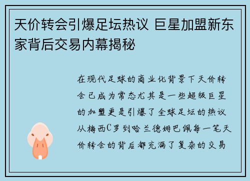在现代足球的商业化背景下,天价转会已成为常态,尤其是一些超级巨星的加盟更是引爆了全球足坛的热议。从梅西、C罗到哈兰德、姆巴佩,每一笔天价转会的背后都充满了复杂的交易内幕与充满诱惑的商业利益。本文将深入...