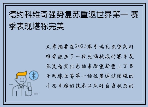 文章摘要:在2023赛季,诺瓦克·德约科维奇经历了一段充满挑战的赛季复苏,凭借其出色的表现重新登上了男子网球世界第一的位置。通过顽强的斗志、卓越的技术以及对自身状态的完美调节,他不仅在赛季初期逐步找回...