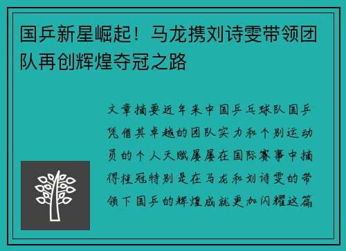文章摘要: 近年来,中国乒乓球队(国乒)凭借其卓越的团队实力和个别运动员的个人天赋,屡屡在国际赛事中摘得桂冠。特别是在马龙和刘诗雯的带领下,国乒的辉煌成就更加闪耀。这篇文章将从四个方面详细探讨国乒新星...