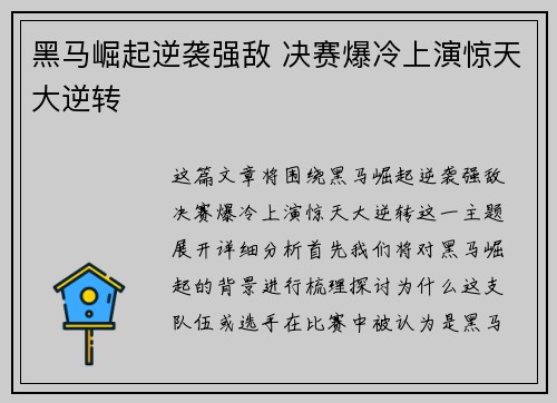 这篇文章将围绕“黑马崛起逆袭强敌,决赛爆冷上演惊天大逆转”这一主题展开详细分析。首先,我们将对黑马崛起的背景进行梳理,探讨为什么这支队伍或选手在比赛中被认为是黑马,以及他们的崛起是如何从一开始的被低估...