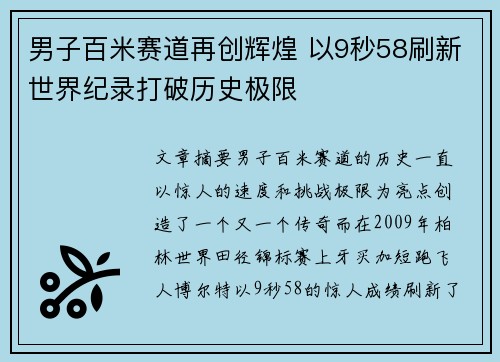 文章摘要:男子百米赛道的历史,一直以惊人的速度和挑战极限为亮点,创造了一个又一个传奇。而在2009年柏林世界田径锦标赛上,牙买加短跑飞人博尔特以9秒58的惊人成绩刷新了百米世界纪录,打破了历史的极限。...