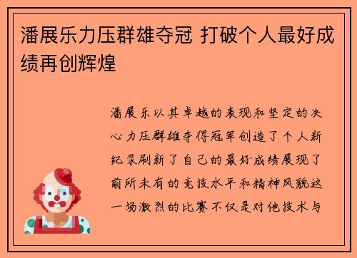 潘展乐以其卓越的表现和坚定的决心,力压群雄夺得冠军,创造了个人新纪录,刷新了自己的最好成绩,展现了前所未有的竞技水平和精神风貌。这一场激烈的比赛,不仅是对他技术与体能的考验,更是对他心理素质的挑战。本...