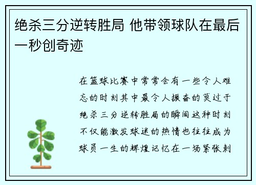 • 绝杀三分逆转胜局 他带领球队在最后一秒创奇迹