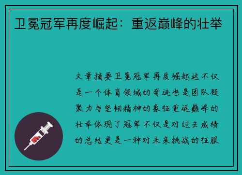 文章摘要:卫冕冠军再度崛起,这不仅是一个体育领域的奇迹,也是团队凝聚力与坚韧精神的象征。重返巅峰的壮举,体现了冠军不仅是对过去成绩的总结,更是一种对未来挑战的征服。本文将从四个方面详细探讨这一壮丽篇章...