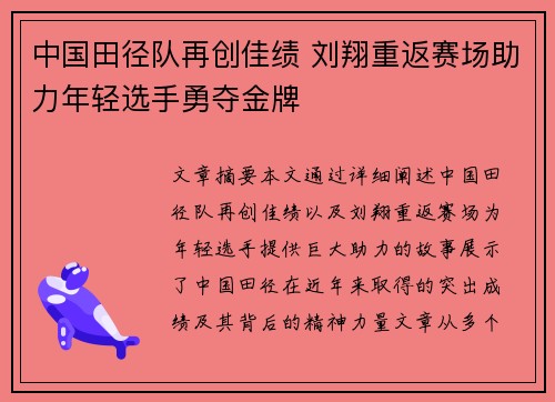文章摘要:本文通过详细阐述中国田径队再创佳绩以及刘翔重返赛场为年轻选手提供巨大助力的故事,展示了中国田径在近年来取得的突出成绩及其背后的精神力量。文章从多个角度探讨了中国田径队的进步和创新,分析了刘翔...