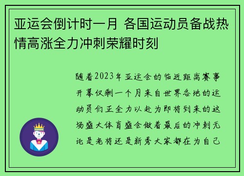 随着2023年亚运会的临近,距离赛事开幕仅剩一个月,来自世界各地的运动员们正全力以赴,为即将到来的这场盛大体育盛会做着最后的冲刺。无论是老将还是新秀,大家都在为自己的荣誉和祖国的荣光而奋力拼搏,备战的...