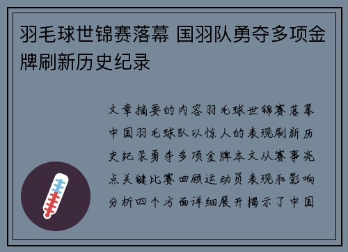 • 羽毛球世锦赛落幕 国羽队勇夺多项金牌刷新历史纪录