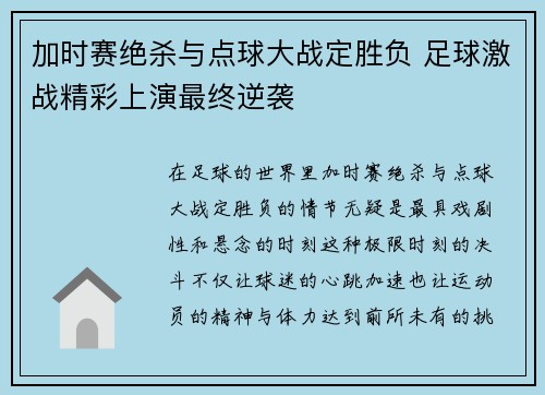 • 加时赛绝杀与点球大战定胜负 足球激战精彩上演最终逆袭