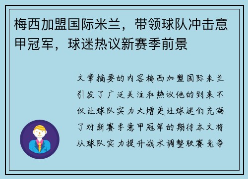 文章摘要的内容:梅西加盟国际米兰,引发了广泛关注和热议。他的到来不仅让球队实力大增,更让球迷们充满了对新赛季意甲冠军的期待。本文将从球队实力提升、战术调整、联赛竞争和球迷情绪四个方面详细阐述梅西加盟国...