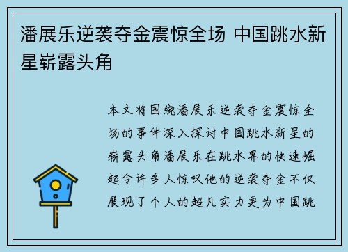 本文将围绕潘展乐逆袭夺金震惊全场的事件,深入探讨中国跳水新星的崭露头角。潘展乐在跳水界的快速崛起令许多人惊叹,他的逆袭夺金不仅展现了个人的超凡实力,更为中国跳水队带来了新的希望。文章将从四个方面详细阐...