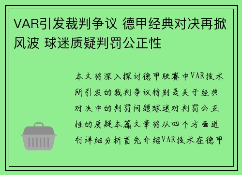 本文将深入探讨德甲联赛中VAR技术所引发的裁判争议,特别是关于经典对决中的判罚问题,球迷对判罚公正性的质疑。本篇文章将从四个方面进行详细分析:首先,介绍VAR技术在德甲的应用及其可能导致的争议;其次,...