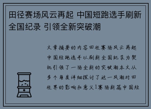 文章摘要的内容:田径赛场风云再起,中国短跑选手以刷新全国纪录为契机,引领了一场全新的突破潮。本文从多个角度详细探讨了这一风潮对田径界的影响和意义。1、赛场新篇中国短跑选手在近年来的赛场上展现出了前所未...