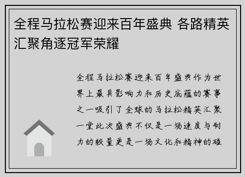 • 全程马拉松赛迎来百年盛典 各路精英汇聚角逐冠军荣耀