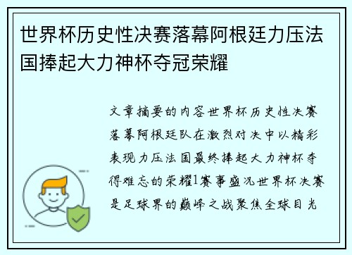 文章摘要的内容:世界杯历史性决赛落幕,阿根廷队在激烈对决中以精彩表现力压法国,最终捧起大力神杯,夺得难忘的荣耀。1、赛事盛况世界杯决赛是足球界的巅峰之战,聚焦全球目光,阿根廷与法国的对决更是一场历史性...