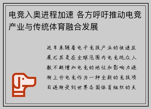 近年来,随着电子竞技产业的快速发展,尤其是在全球范围内电竞观众人数不断增加,电竞的地位和影响力逐渐上升。电竞作为一种全新的竞技项目,逐渐受到世界各国体育组织的关注。特别是国际奥委会(IOC)对于电竞是...