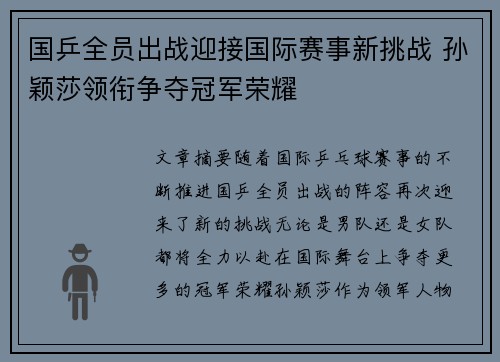 文章摘要:随着国际乒乓球赛事的不断推进,国乒全员出战的阵容再次迎来了新的挑战。无论是男队还是女队,都将全力以赴,在国际舞台上争夺更多的冠军荣耀。孙颖莎作为领军人物,将肩负起重任,力争为国家队赢得更多的...
