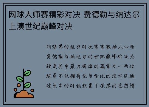 网球界的经典对决常常激动人心,而费德勒与纳达尔的世纪巅峰对决,无疑是其中最为辉煌的篇章之一。两位球员不仅拥有无与伦比的技术,还通过长年的对抗积累了深厚的恩怨情仇,每一次碰面都充满了悬念与期待。在网球大...