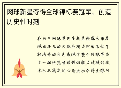 在当今网球界,许多新星崭露头角,展现出非凡的天赋和潜力。然而,某位年轻选手的出色表现,令整个网球界为之一振。他凭借顽强的毅力、过硬的技术以及稳定的心态,成功夺得全球网球锦标赛冠军,创造了属于自己的历史...