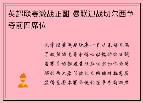 文章摘要:英超联赛一直以来都充满了激烈的竞争和惊心动魄的对决。随着赛季的推进,曼联和切尔西作为英超的两大豪门,彼此之间的对抗愈发显得重要。本赛季,他们在争夺前四席位的过程中,频繁交锋,成为了英超联赛最...