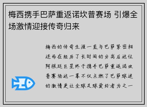 梅西的传奇生涯一直与巴萨紧密相连,而在经历了长时间的分离后,这位阿根廷巨星终于携手巴萨重返诺坎普赛场。这一幕,不仅点燃了巴萨球迷的激情,更让全球足球爱好者为之一振。梅西的回归不仅是个人荣誉的体现,更是...