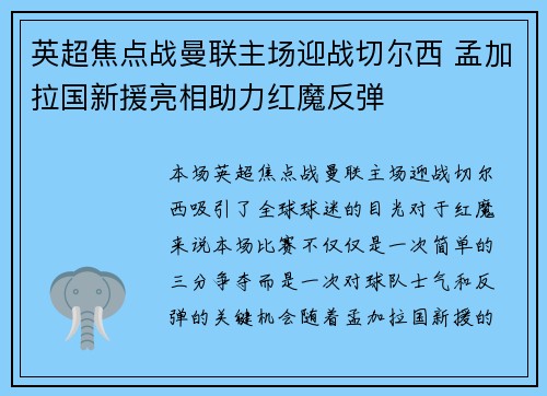 • 英超焦点战曼联主场迎战切尔西 孟加拉国新援亮相助力红魔反弹