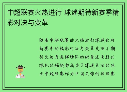 随着中超联赛的火热进行,球迷们对新赛季的精彩对决与变革充满了期待。无论是老牌强队的较量,还是新兴球队的崛起,都成为了球迷关注的焦点。中超联赛作为中国足球的顶级赛事,始终承载着无数球迷的梦想和热情。新赛...