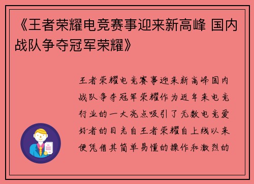 • 《王者荣耀电竞赛事迎来新高峰 国内战队争夺冠军荣耀》