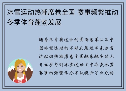 随着冬季奥运会的圆满落幕以及中国冰雪运动的不断发展,近年来冰雪运动的热潮席卷全国,越来越多的人开始参与到冰雪运动之中。各类冰雪赛事的频繁举办不仅提升了公众的参与热情,也推动了冬季体育事业的蓬勃发展。本...