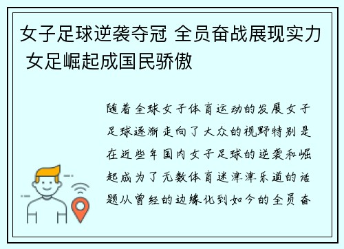 随着全球女子体育运动的发展,女子足球逐渐走向了大众的视野,特别是在近些年,国内女子足球的逆袭和崛起成为了无数体育迷津津乐道的话题。从曾经的边缘化到如今的全员奋战,战胜诸多强队,最终取得荣耀的骄人成就,...