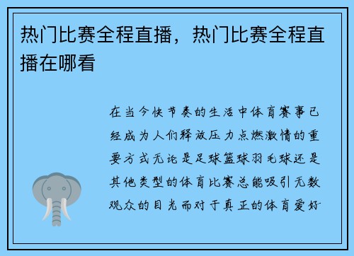 • 热门比赛全程直播,热门比赛全程直播在哪看