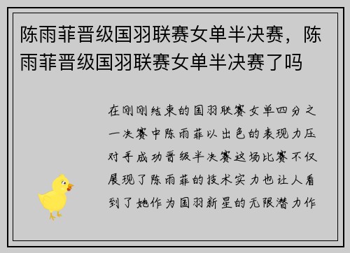 • 陈雨菲晋级国羽联赛女单半决赛,陈雨菲晋级国羽联赛女单半决赛了吗