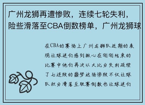 在CBA的赛场上,广州龙狮队近期的表现让球迷们感到揪心。在刚刚结束的比赛中,他们再次以大比分失利,延续了七连败的噩梦。这场惨败不仅让球队积分滑落至联赛倒数,也让球迷们对球队的未来产生了深深的忧虑。 事...