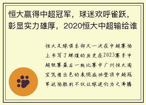 恒大足球俱乐部又一次在中超赛场上书写了辉煌的历史。在2023赛季中超联赛最后一轮比赛中,广州恒大淘宝凭借出色的表现,成功登顶中超冠军。这场胜利不仅让球迷们为之沸腾,也再次证明了恒大在中超赛场上的统治力...