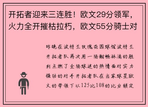 昨晚,在波特兰玫瑰花园球馆,波特兰开拓者队再次用一场酣畅淋漓的胜利点燃了全场球迷的热情!面对实力强劲的对手,开拓者队在当家球星欧文的带领下,以125比108的比分锁定胜局,豪取三连胜!这场比赛不仅让球...