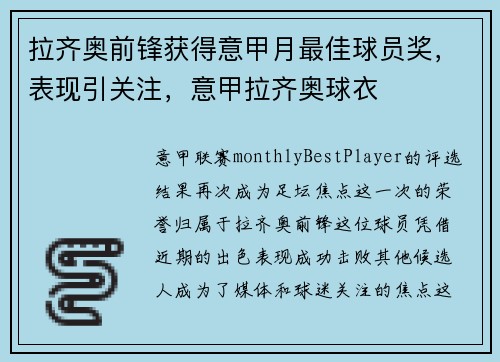意甲联赛monthlyBestPlayer的评选结果再次成为足坛焦点,这一次的荣誉归属于拉齐奥前锋。这位球员凭借近期的出色表现,成功击败其他候选人,成为了媒体和球迷关注的焦点。这篇文章将带您深入了解他...