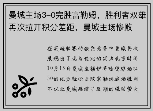 在英超联赛的激烈竞争中,曼城再次展现出了无与伦比的实力。北京时间10月15日,曼城坐镇伊蒂哈德球场,以3-0的比分轻松击败富勒姆。这场胜利不仅让曼城延续了近期的强劲势头,也让“胜利者双雄”(曼城与阿森...