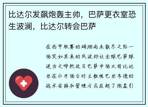 在西甲联赛的硝烟尚未散尽之际,一场突如其来的风波却让全球巴萨球迷为之哗然。近日,巴萨中场大将比达尔在公开场合对主教练巴尔韦德的战术安排和管理方式发起了炮轰,引发了外界对球队更衣室和谐程度的广泛猜测。这...