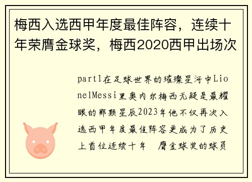 part1 在足球世界的璀璨星河中,LionelMessi(里奥内尔·梅西)无疑是最耀眼的那颗星辰。2023年,他不仅再次入选西甲年度最佳阵容,更成为了历史上首位连续十年榮膺金球奖的球员。这一成就不仅...