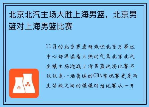 11月的北京,寒意渐浓,但北京万事达中心却洋溢着火热的气氛。北京北汽坐镇主场,迎战上海男篮。这场比赛不仅仅是一场普通的CBA常规赛,更是两支劲旅之间的强强对话。比赛从一开始就充满了悬念和激情,双方你来...