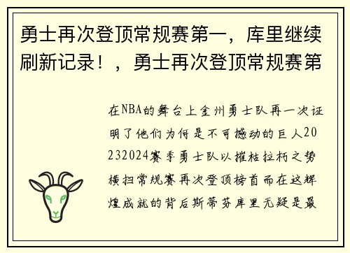 在NBA的舞台上,金州勇士队再一次证明了他们为何是不可撼动的巨人。2023-2024赛季,勇士队以摧枯拉朽之势,横扫常规赛,再次登顶榜首。而在这辉煌成就的背后,斯蒂芬·库里无疑是最大的功臣。他的表现不...