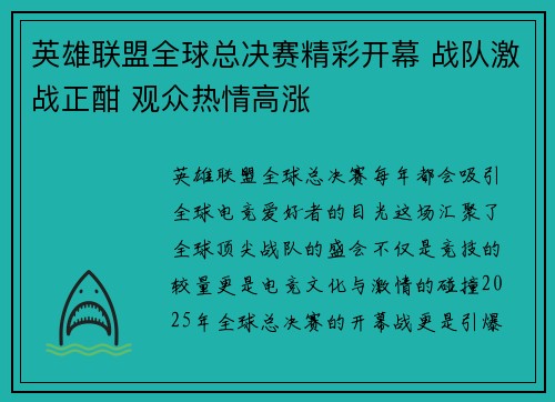 英雄联盟全球总决赛,每年都会吸引全球电竞爱好者的目光。这场汇聚了全球顶尖战队的盛会不仅是竞技的较量,更是电竞文化与激情的碰撞。2025年,全球总决赛的开幕战更是引爆了全场观众的热情,精彩的赛事和激烈的...