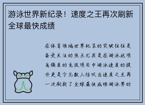 在体育领域,世界纪录的突破往往是备受关注的焦点,尤其是在游泳这项高强度的竞技项目中,游泳速度的提升更是令无数人惊叹。当“速度之王”再一次刷新了全球最快成绩,游泳界的震动无疑为所有热爱体育的人们带来了一...