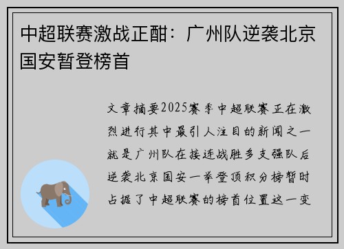文章摘要:2025赛季中超联赛正在激烈进行,其中最引人注目的新闻之一就是广州队在接连战胜多支强队后逆袭北京国安,一举登顶积分榜,暂时占据了中超联赛的榜首位置。这一变化无疑让球迷和媒体都充满了期待与关注...