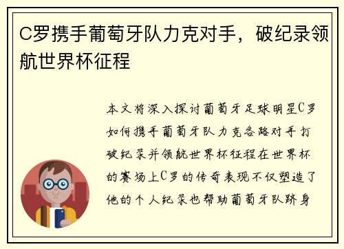 本文将深入探讨葡萄牙足球明星C罗如何携手葡萄牙队,力克各路对手,打破纪录并领航世界杯征程。在世界杯的赛场上,C罗的传奇表现不仅塑造了他的个人纪录,也帮助葡萄牙队跻身世界足坛的顶尖之列。文章将从四个方面...