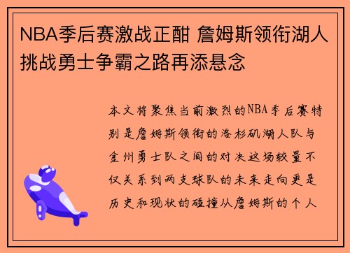 • NBA季后赛激战正酣 詹姆斯领衔湖人挑战勇士争霸之路再添悬念