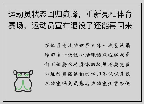 在体育竞技的世界里,每一次重返巅峰都是一场惊心动魄的旅程。运动员们不仅要面对身体的极限,还要克服心理的煎熬。他们的回归不仅仅是技术的重现,更是意志力的重生。 曾经,他们站在聚光灯下,是万人瞩目的焦点。...
