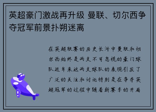 在英超联赛的历史长河中,曼联和切尔西始终是两支不可忽视的豪门球队。近年来,这两支球队的表现引发了广泛的关注和讨论,特别是在争夺英超冠军的过程中。随着新赛季的开局,曼联与切尔西之间的激烈竞争再次进入了大...
