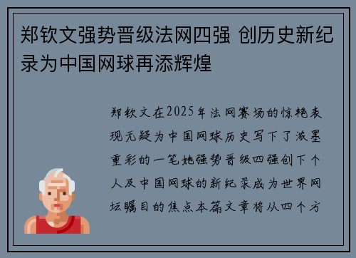 郑钦文在2025年法网赛场的惊艳表现,无疑为中国网球历史写下了浓墨重彩的一笔。她强势晋级四强,创下个人及中国网球的新纪录,成为世界网坛瞩目的焦点。本篇文章将从四个方面详细阐述郑钦文如何凭借顽强的毅力与...